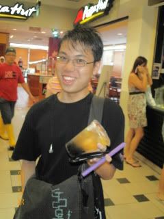 Pissed and Sian-ed,we decided to go Kovan.Andy went to buy cute little snoopy plaster,which i kope like 10.from the 25 pathetic pieces.Ahaha.Anway,we went to raid watsons.Lol.They got this but 10 get 1 free.So we buy buy buy,choose choose choose.We got 8 bars of Kitkats,2 shampoos(giant size) and a supposedly FREE moisturser or something.But,nuuuu~2 Kitkats bars is counts as ONE item.So unfair right.So we decided to take picture outside the shop to protest.